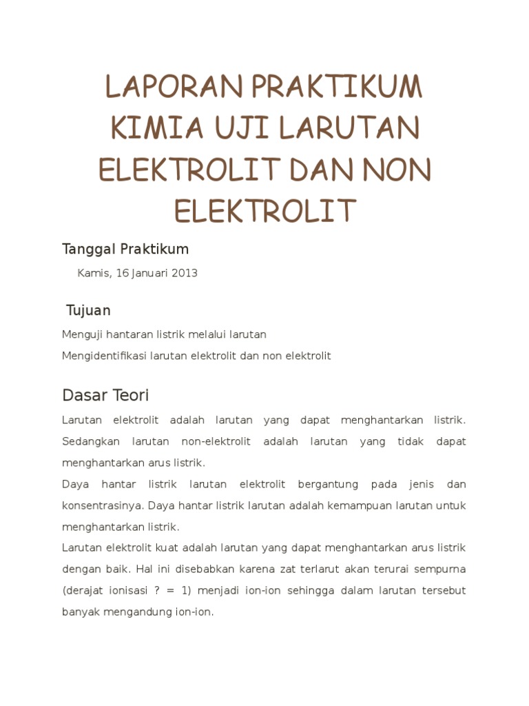 Laporan Praktikum Kimia Uji Larutan Elektrolit Dan Non Elektrolit Doc