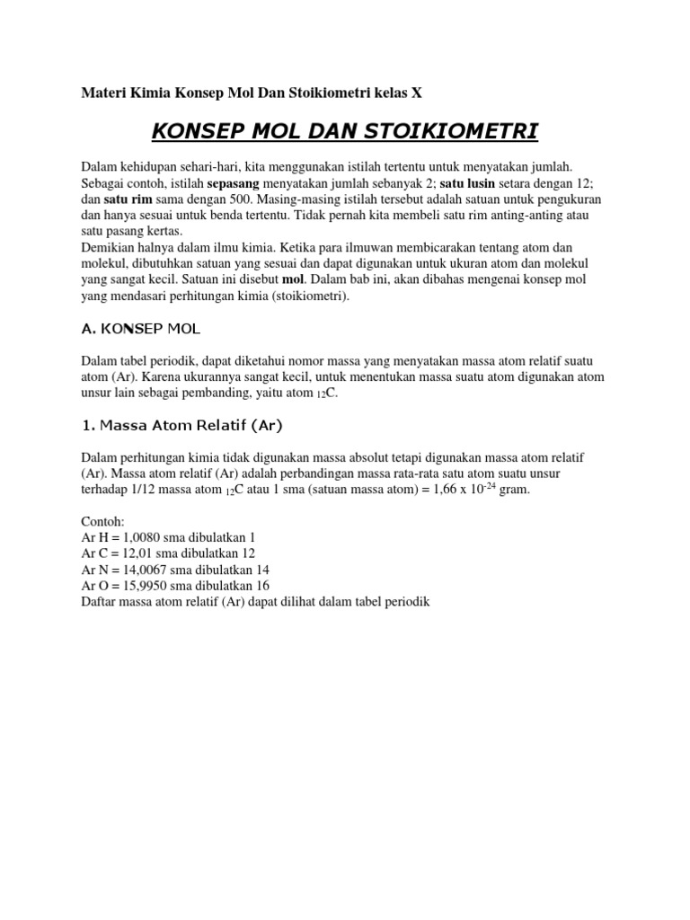 Materi Kimia Konsep Mol Dan Stoikiometri Kelas X