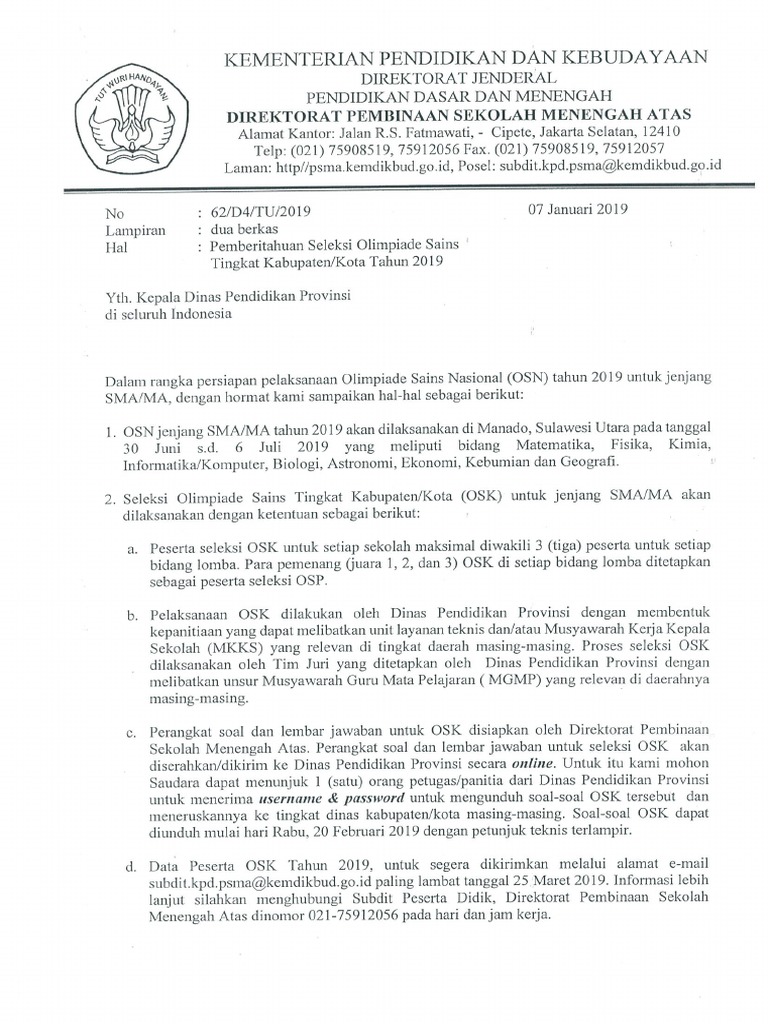 Pedoman Pelaksanaan Osn Sma 2019 Osp Osk Informasi Pendidikan