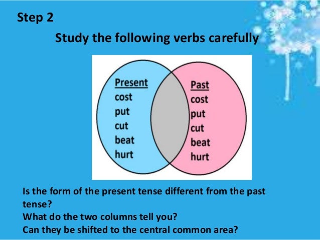 Past tense diagram. Present tense to past tense worksheets showing all 8 printables. Simple past tense verbs show actions that took place in the past. Use a venn diagram to decide whether the items are from the past present or both.