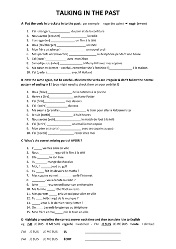 French Grammar Exercises Worksheets Tenses Worksheets Past Tense