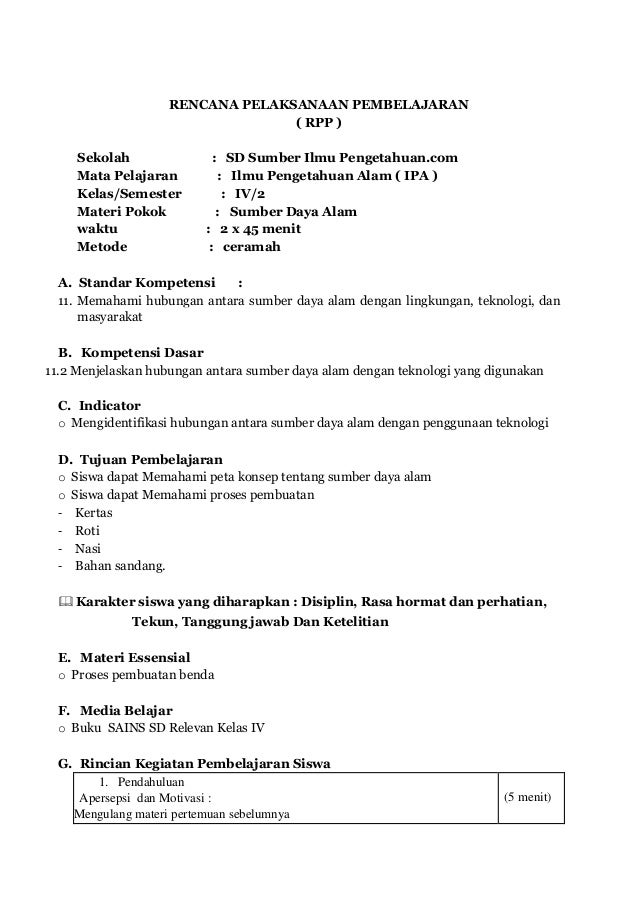Contoh Rpp Mata Pelajaran Ipa Kelas Iv Sd