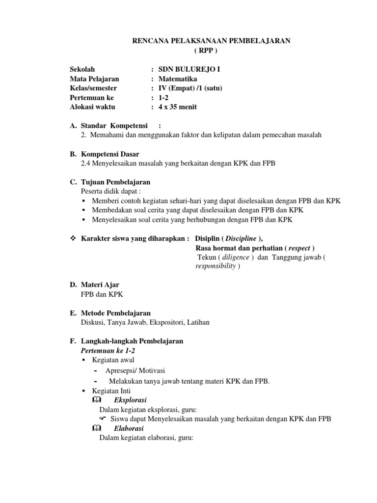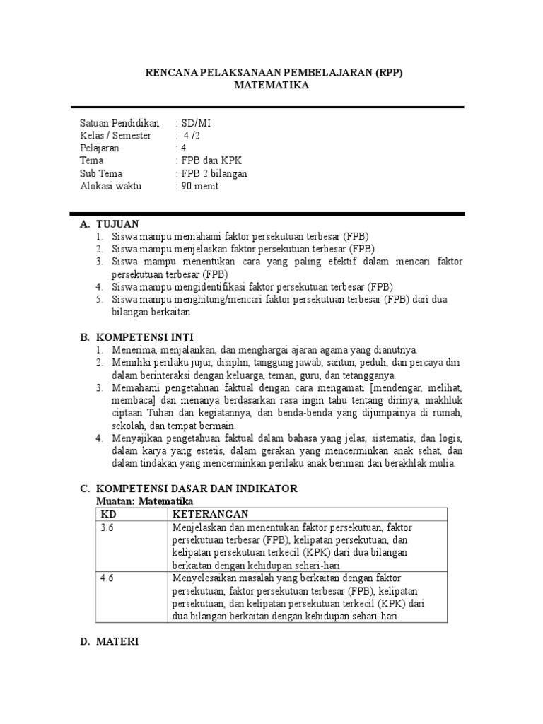 Contoh Rpp Matematika Sd Kelas Iv Semester I Tentang Fpb Dan Kpk