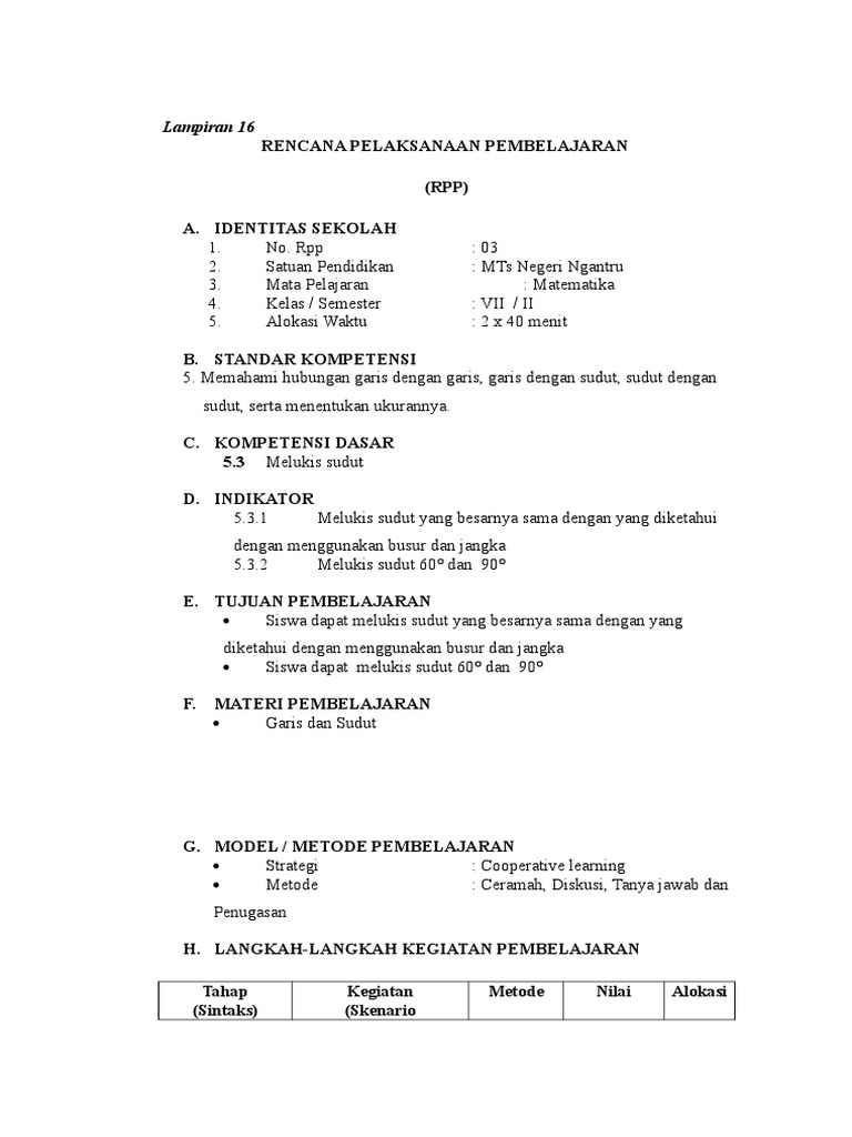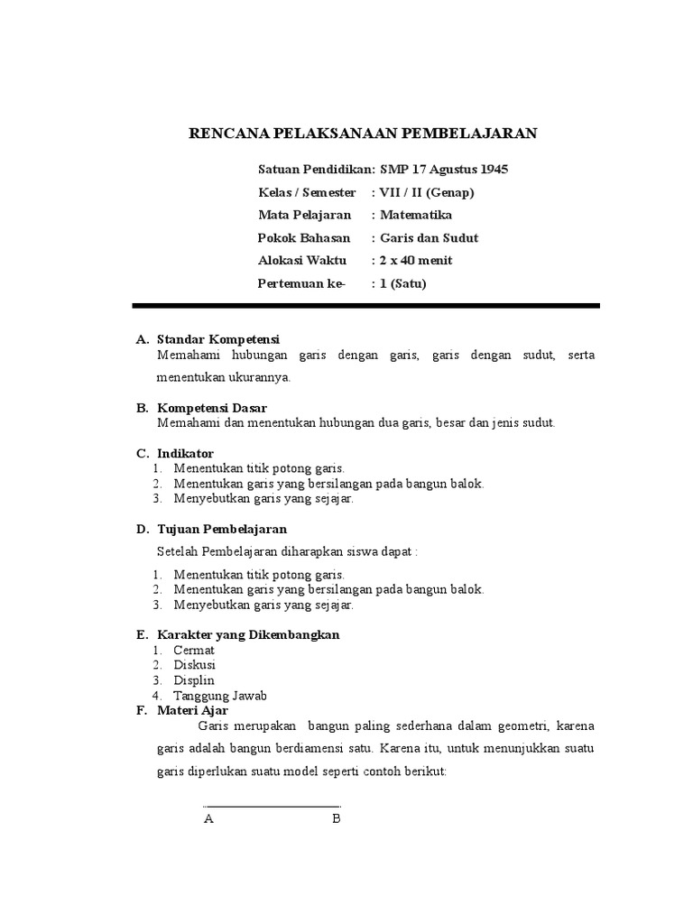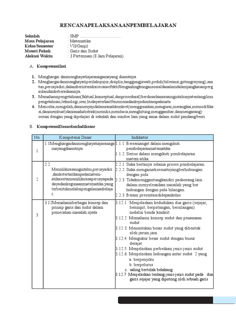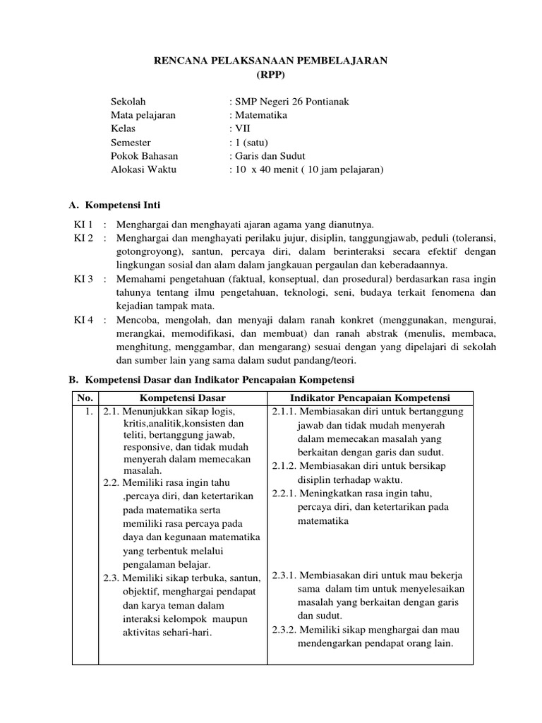 Rpp Matematika Smp Kelas Vii Bab Garis Dan Sudut