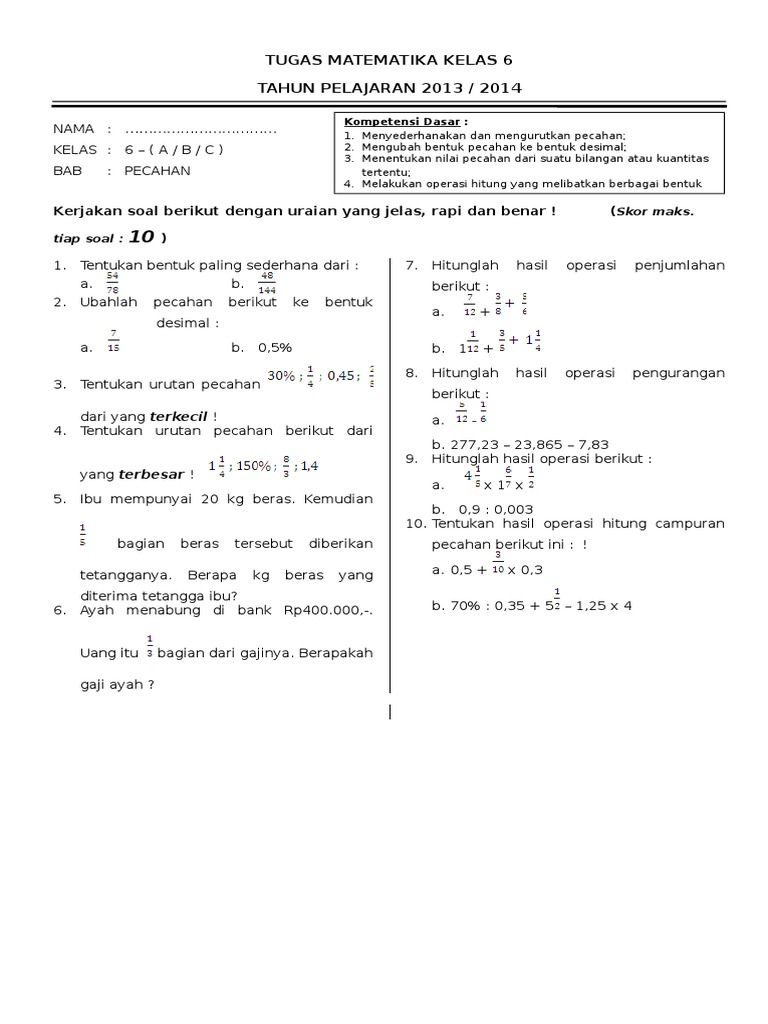 Soal Matematika Kelas 6 Sd Semester Ii Ulangan Bab 5 Pecahan I
