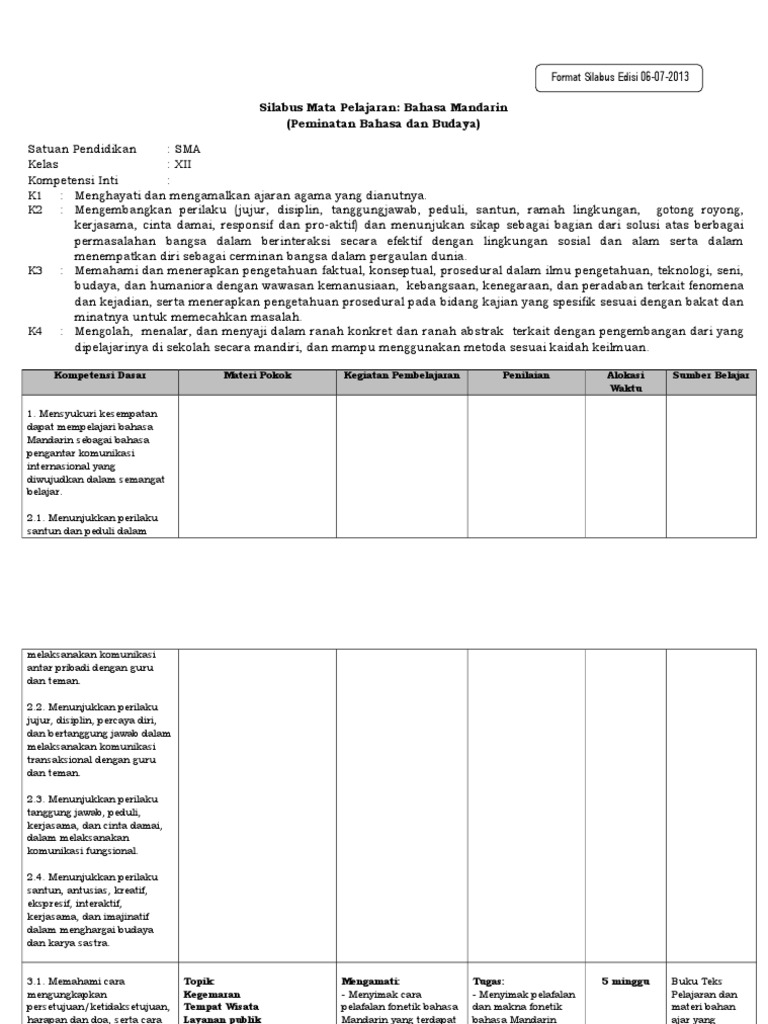 Silabus Mata Pelajaran Bahasa Mandarin Program Bhs Bdy Kelas