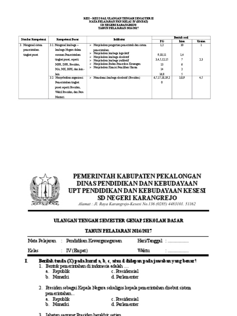 Soal Ulangan Akhir Semester 1 Mata Pelajaran Pkn Kelas Iv Sd Blog