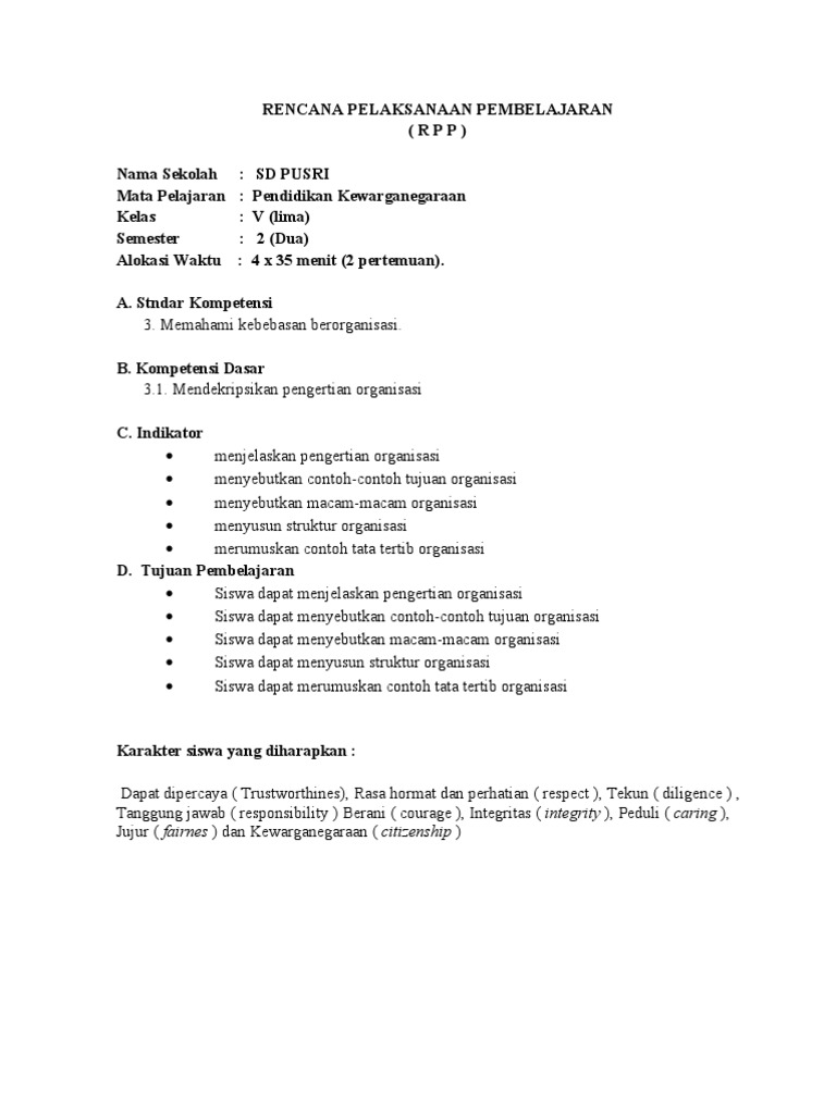 Rpp Pkn Sd Kelas 5 Semester 2 Materi Organisasi Di Lingkungan