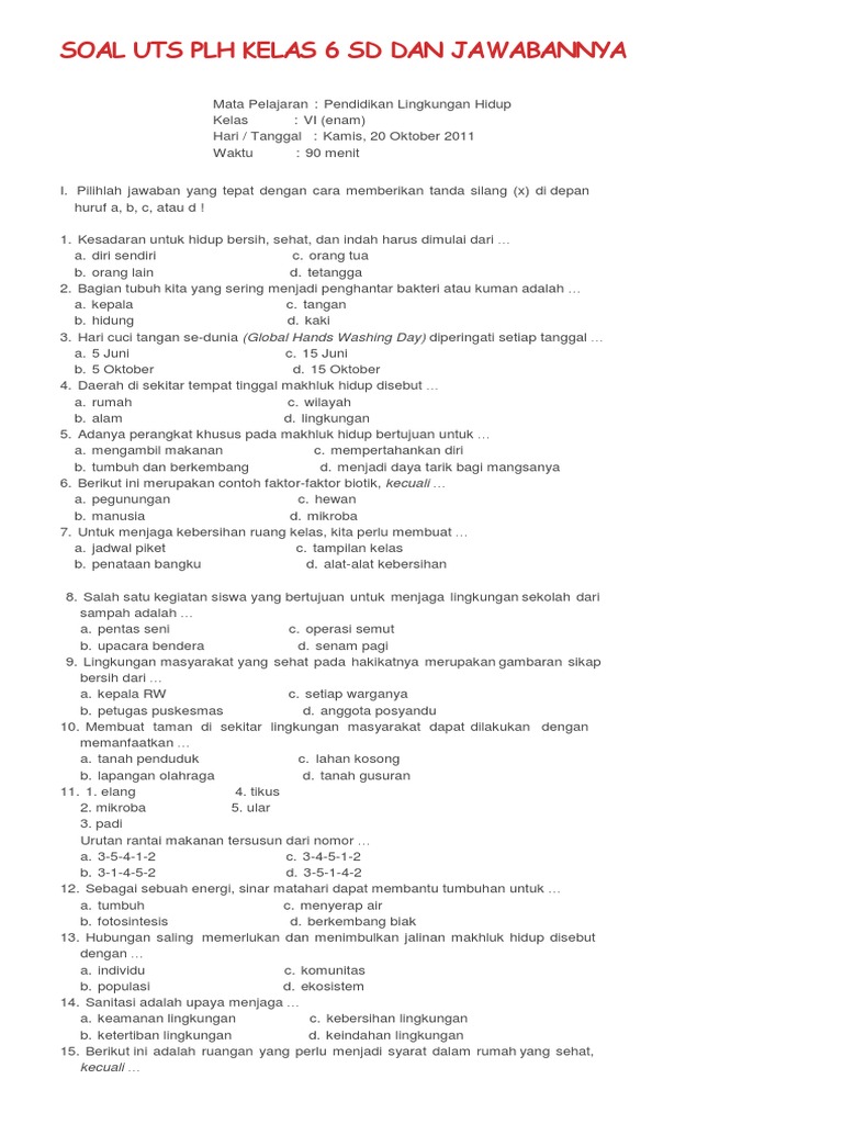 Soal Uts Plh Kelas 6 Sd Dan Jawabannya