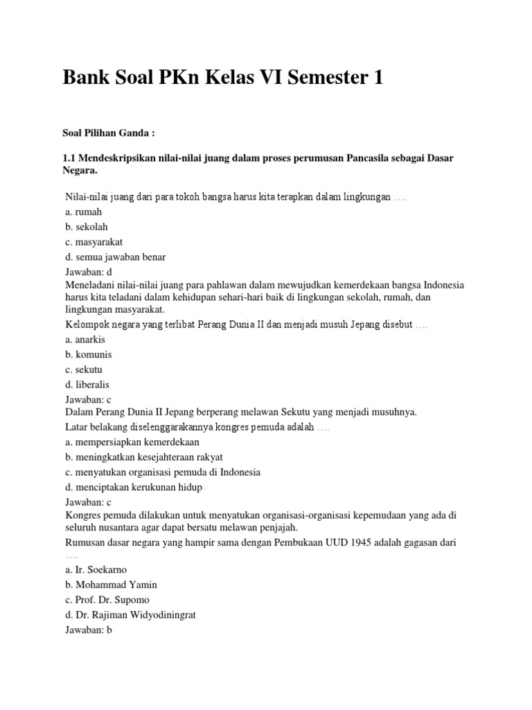 Bahan Soal Uas Pas Pkn Kelas 6 Semester 1 Dan Kunci Jawaban