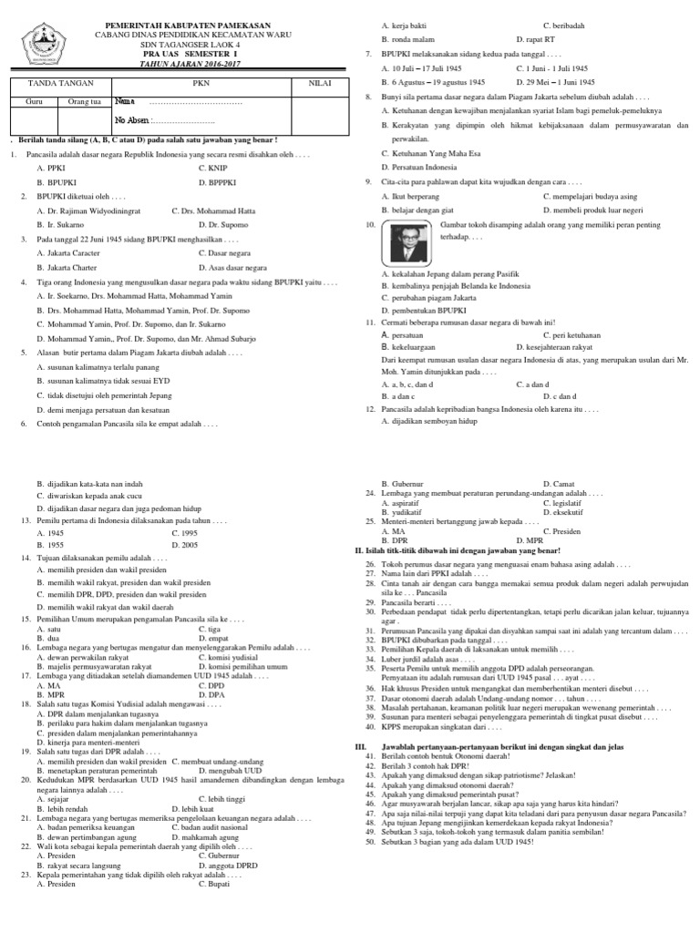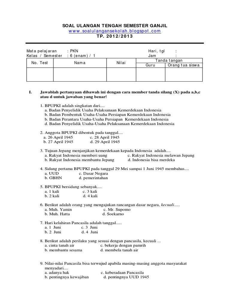 Download Soal Uts Pkn Kelas 6 Semester Ganjil News Info Ops Dan Guru