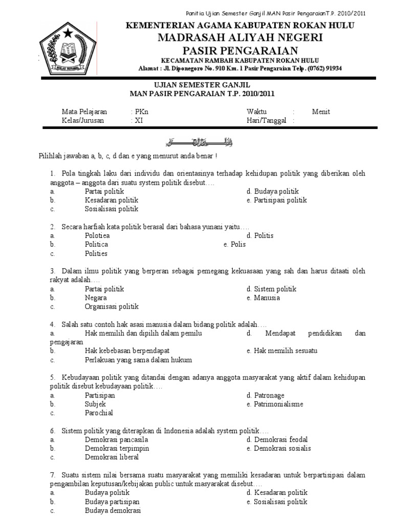 Soal Pkn Ujian Sekolah Kelas 6 Sd Tahun 2018