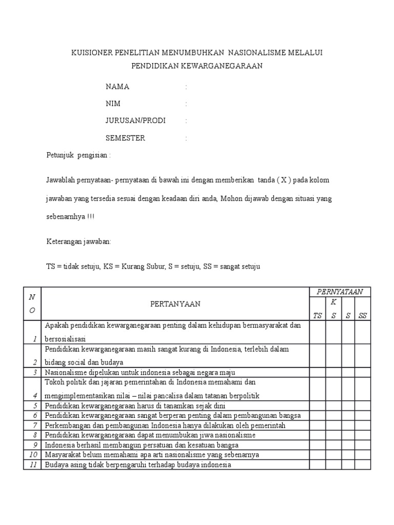 Kuisioner Penelitian Menumbuhkan Nasionalisme Melalui Pendidikan