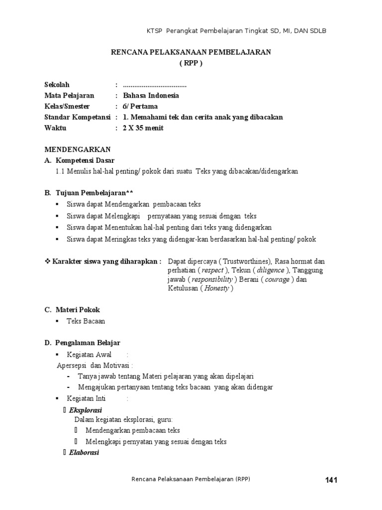 Download Rpp Ktsp Bahasa Indonesia Kelas 1 S D 6 Semester 1 Dan 2