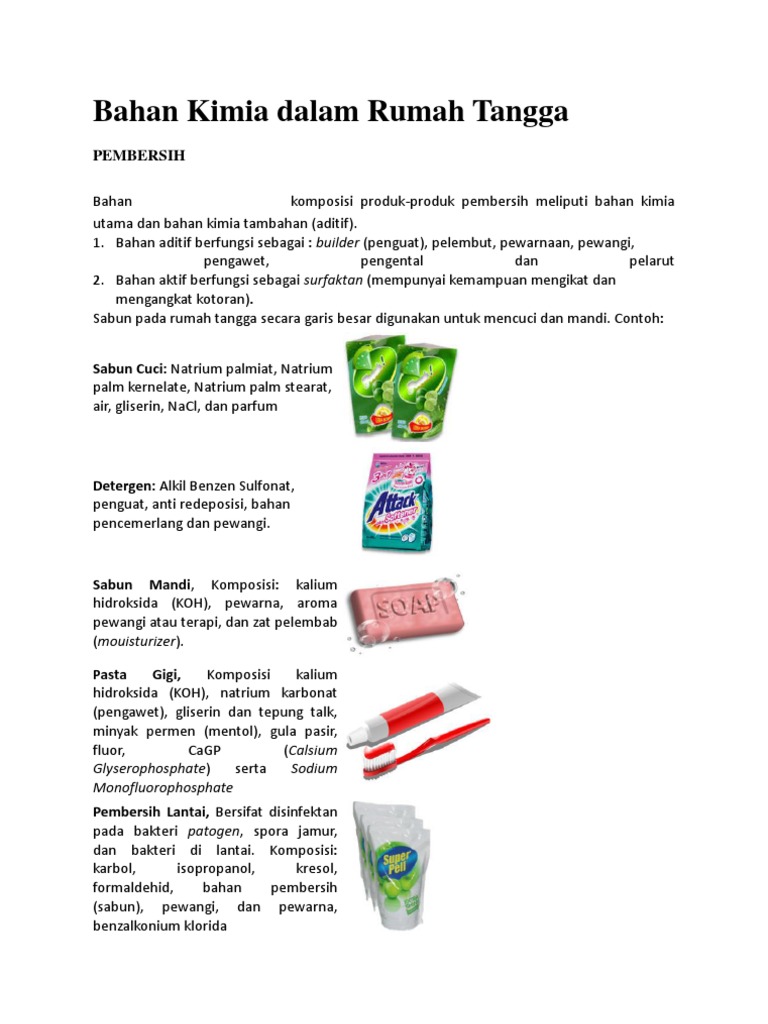 Bahan kimia rumah tangga merupakan jenis bahan kimia yang sering kita jumpai serta dipergunakan dalam kehidupan. Gliserin merupakan cairan bening yang sering digunakan dalam pembuatan obat obatan makanan sabun. Gliserin dapat dilarutkan dengan mudah menjadi alkohol dan air tetapi tidak menjadi minyak.