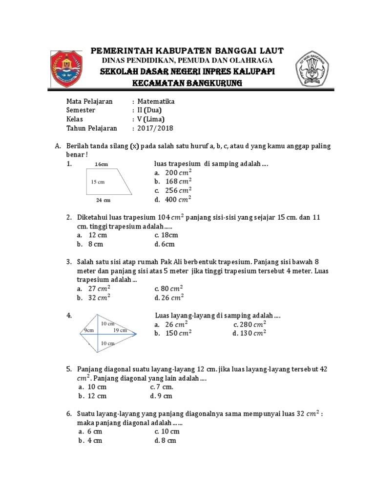 Soal Matematika Kelas 5 Sd Bab 4 Trapesium Dan Layang Layang