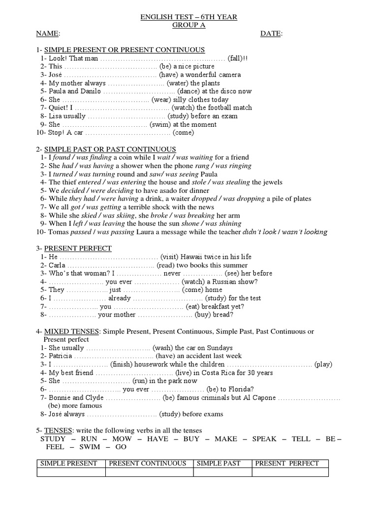 English Test 6th Grammatical Tense