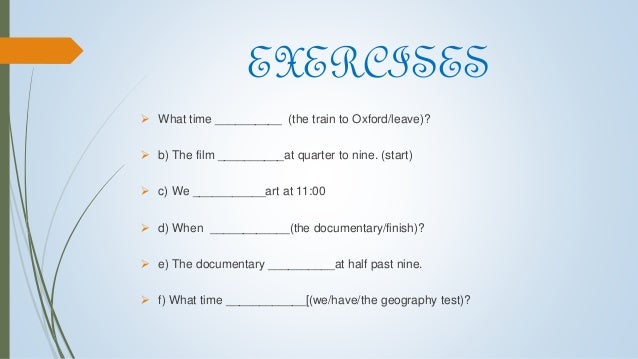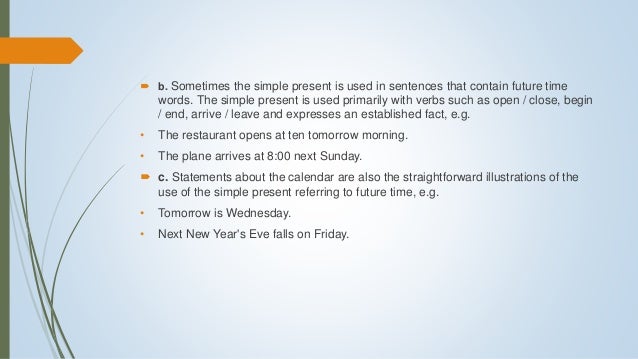 Movie segments to assess grammar goals contains a series of movie segments and activities to assess or practice grammar points through fun challenging. Present simple tense is used to state an action which occurs on regular basis in present. Present simple and continuous with a future meaning exercise present simple for timetables the flight leaves at 11 am.