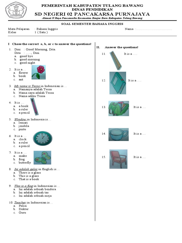 Soal Bahasa Inggris Kelas 1 Sd