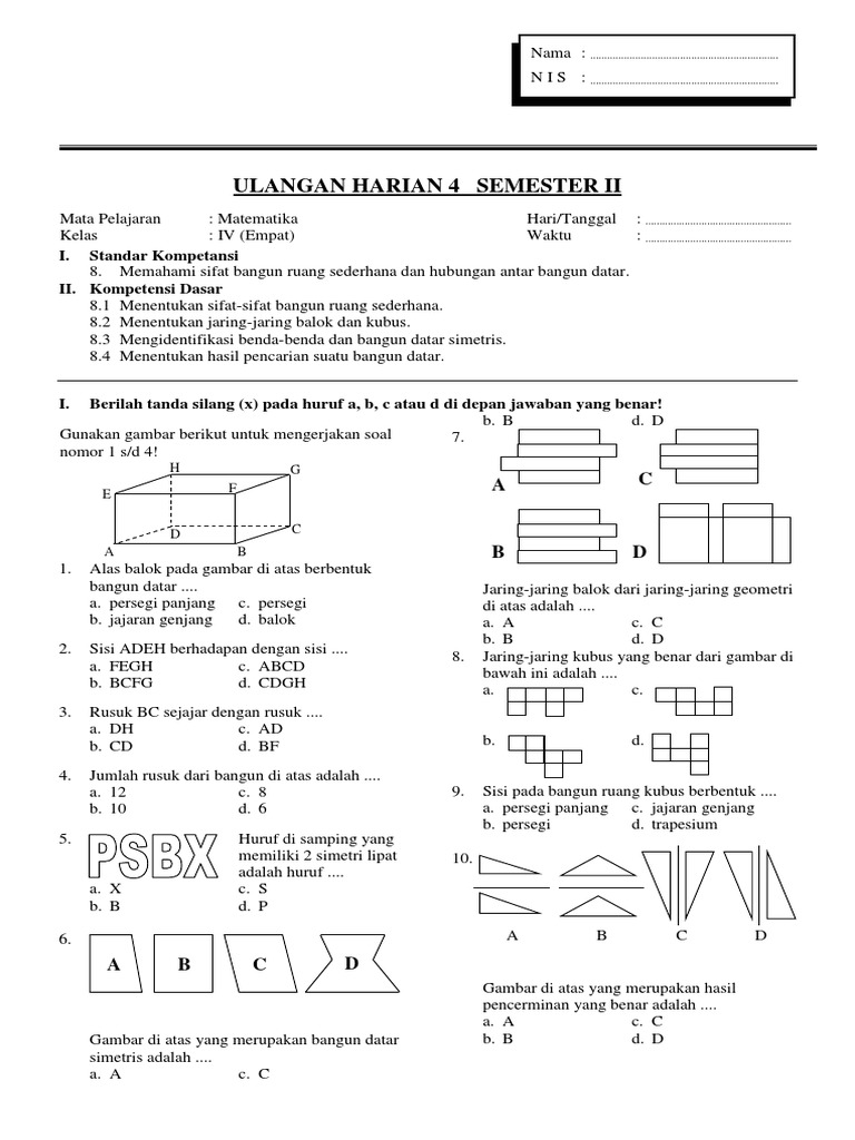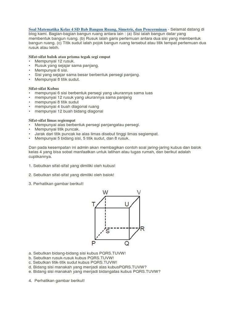 Soal Matematika Kelas 4 Sd Bab 10 Bangun Ruang Dan Kesimetrian