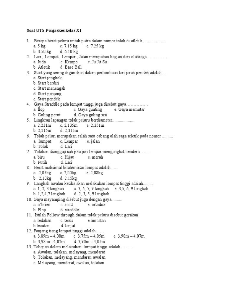 Berilah tanda silang x pada huruf a b c. Berikut ini adalah contoh soal uts penjasorkes penjaskes kelas 7 smpmts semester 1 gasal ganjil. Download contoh latihan soal mid uts ulangan tengah semester 2 genap kelas x dan xi sma ma mapel penjaskes kunci jawaban.