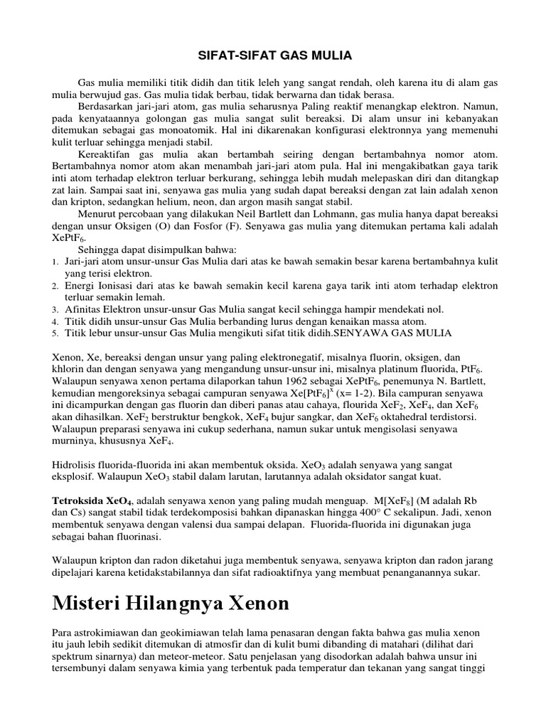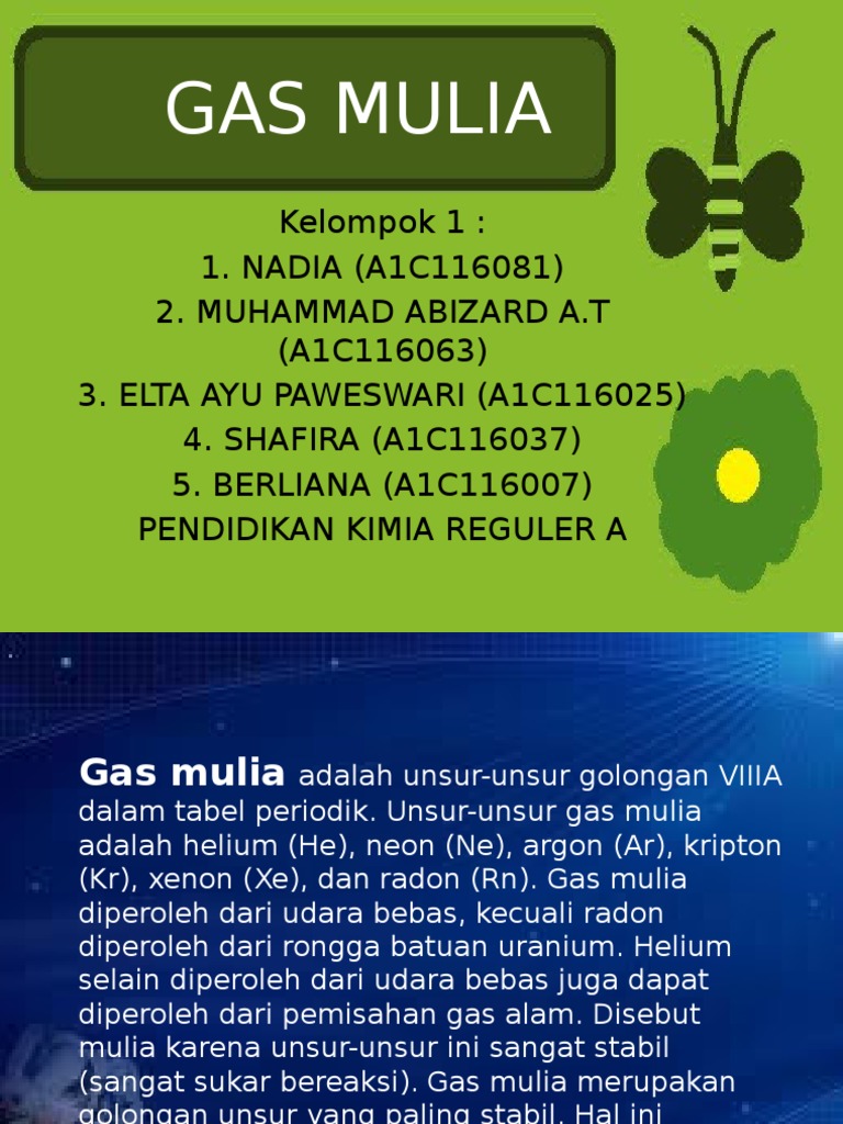 Pengertian gas mulia gas mulia adalah gas yang mempunyai sifat lengai tidak reaktif dan susah bereaksi dengan bahan kimia lain. Unsur unsur yang termasuk gas mulia adalah helium 2 he neon 10 ne argon 18 ar kripton. Puji syukur kami panjatkan kehadirat allah swt karena atas limpahan rahmat dan karunianya sehingga makalah ini yang berjudul manfaat dan dampak unsur unsur kimia.