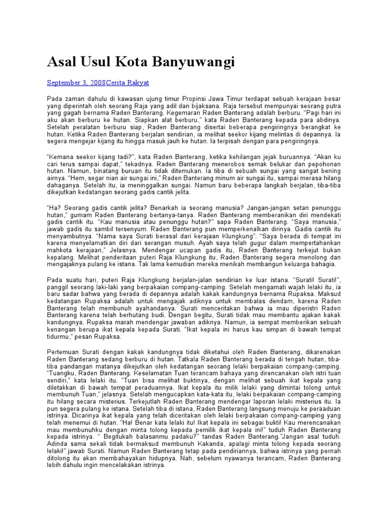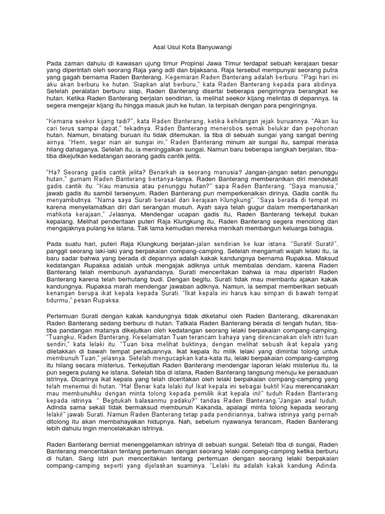 Dongeng asal mula kota banyuwangi dongeng indonesia pada zaman dahulu di kawasan ujung timur provinsi jawa timur terdapat sebuah kerajaan besar yang. Legenda bahasa jawa asal usul banyuwangi konon riyen kala wilayah ujung wetan pulau jawi ingkang alamnya mekaten sae niki dipunpangagengi dening satiyang ratu. Pada zaman dahulu di kawasan ujung timur propinsi jawa timur terdapat sebuah kerajaan besar yang diperintah oleh seorang raja yang adil dan bijaksana.