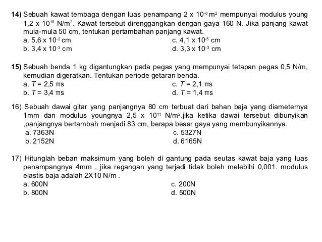 Regangandalam elastisitas adalah pertambahan panjang yang terjadi pada suatu benda karena pengaruh gaya luar per panjang. Soal dan jawaban tts memberikan bank soal soal dan kunci jawaban soal dan jawaban tts. Kunci jawaban tts untuk pertanyaan benda yang memiliki gaya pegas di jawaban tts.