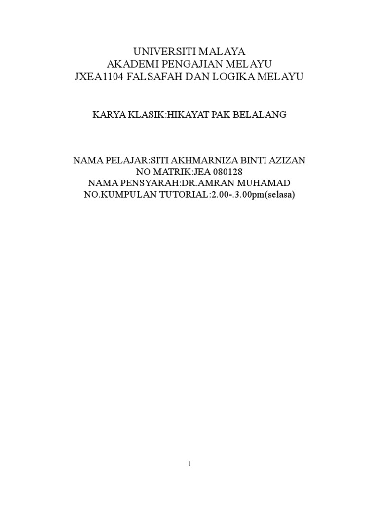 Struktur Karya Dan Nilai Budaya Dalam Hikayat Pak Belalang Dan Lebai