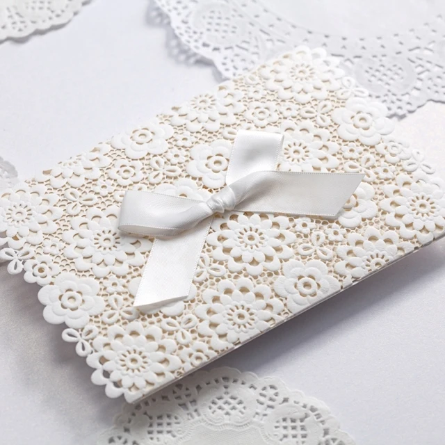 50 Pcs Lace Undangan Pernikahan Elegan Timbul Putih Pita Kupu Kupu