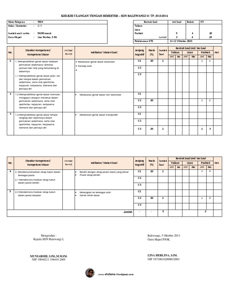 Kisi Kisi Dan Soal Uts 1 Pjok Kelas I