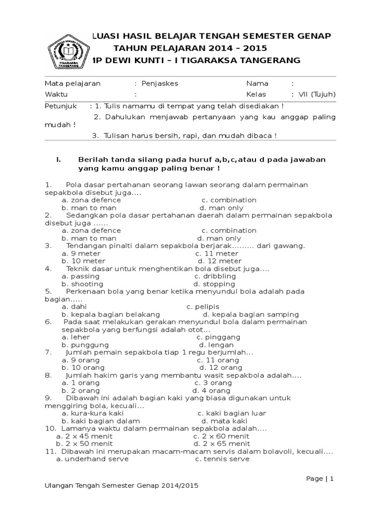 Kumpulan Soal Pjok Smp Kelas 7 Semester 1 Didno76 Com