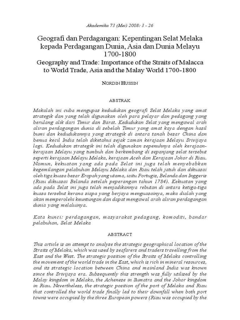 Nordin hussin 2008 geografi dan perdagangan. Kepentingan selat melaka kepada perdagangan dunia asia dan dunia melayu 1700 1800.