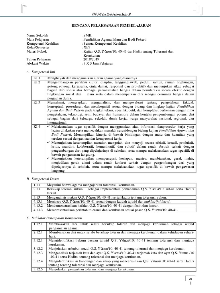 Rpp Pai Xi Kurikulum 2013 Ser I2 6 Toleransi Dan Kerukunan