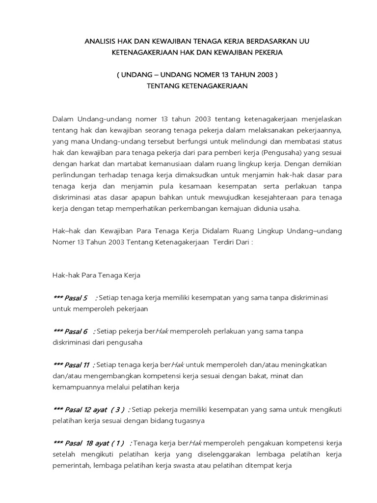 Dalam ringkasan undang undang tentang ketenagakerjaan hak dan kewajiban terhadap para tenaga kerja diatas dapat kita simpulkan bahwa hubungan antara pengusaha. Hak dan kewajiban tenaga kerja adalah salah satu hal paling pokok dalam suatu bisnis. Tanpa hak dan kewajiban yang jelas maka kegiatan bisnis suatu perusahaan tidak.