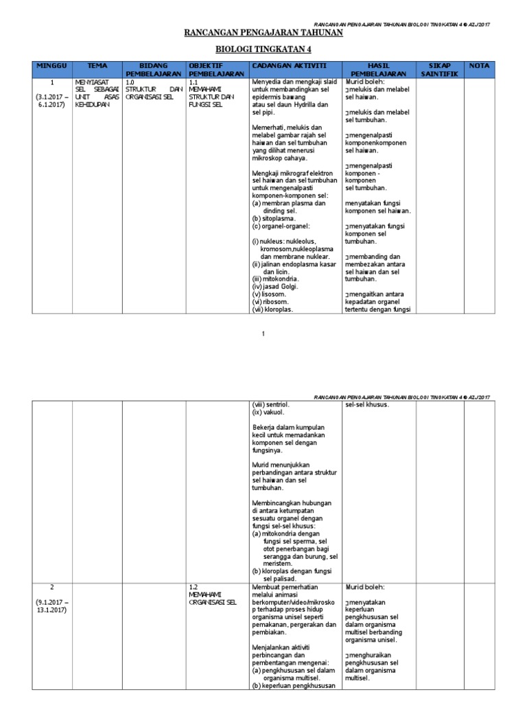 Rancangan Pengajaran Tahunan Biologi Tingkatan 4 2017 Bm