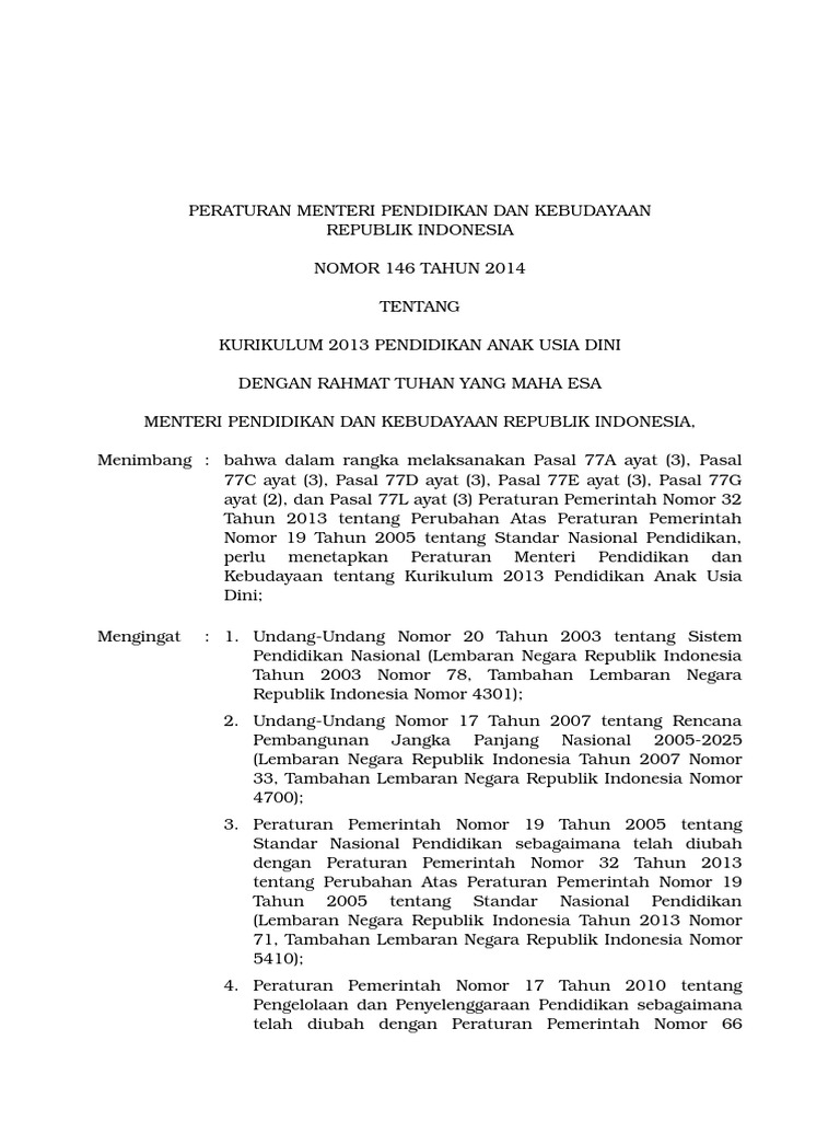 Salinan peraturan menteri pendidikan dan kebudayaan republik indonesia nomor 146 tahun 2014 tentang kurikulum 2013 pendidikan anak usia dini dengan rahmat tuhan yang. Kerangka dasar dan struktur kurikulum 2013 paud ra tk kb ini masih diatur dalam permendikbud nomor 146 tahun 2014 tentang kerangka dasar dan struktur kurikulum. Salinan lampiran i peraturan menteri pendidikan dan kebudayaan republik indonesia nomor 146 tahun 2014 tentang kurikulum 2013 pendidikan anak usia dini.