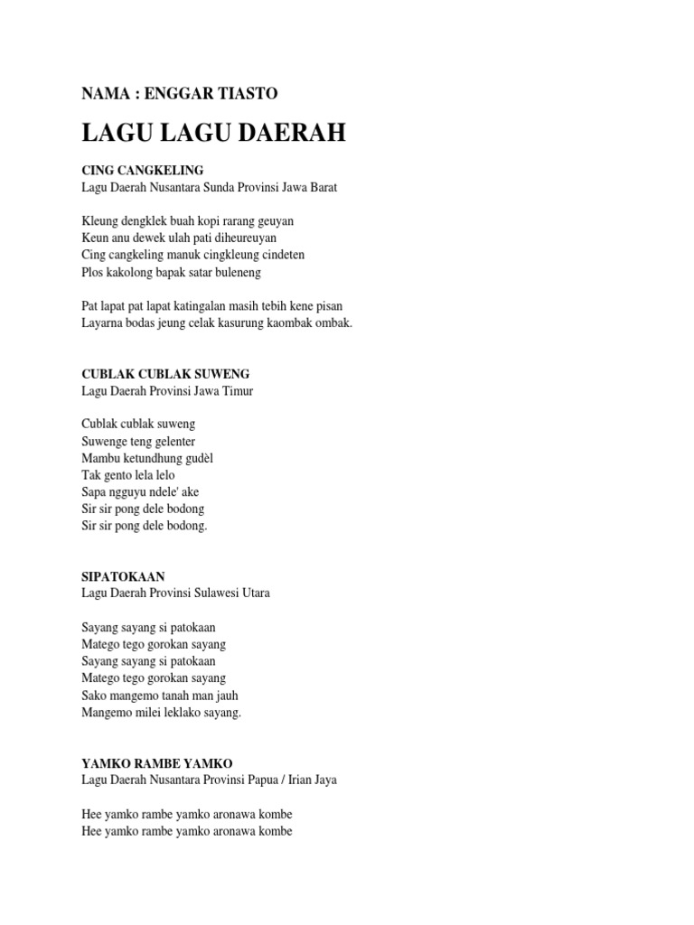 34 Provinsi Lirik Lagu Daerah Di Indonesia
