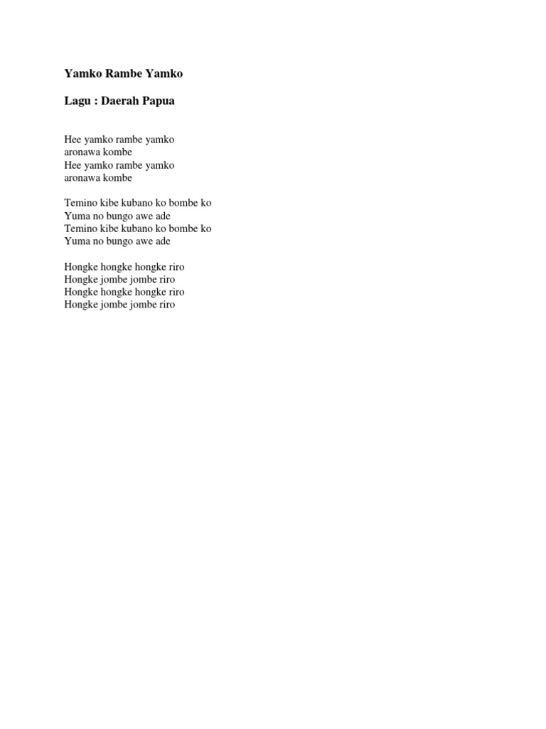 Namun pada kesempatan kali ini kami hanya mengumpulkan 50 kumpulan lagu lagu daerah yang sudah sering kita dengar. Hee yamko rambe yamko aronawa kombe hee yamko rambe yamko aronawa kombe temino kibe kubano ko bombe ko yuma no bungo awe ade temino.