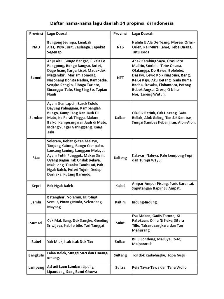 Doc Daftar Nama Nama Lagu Daerah 34 Propinsi Di Indonesia Kevin