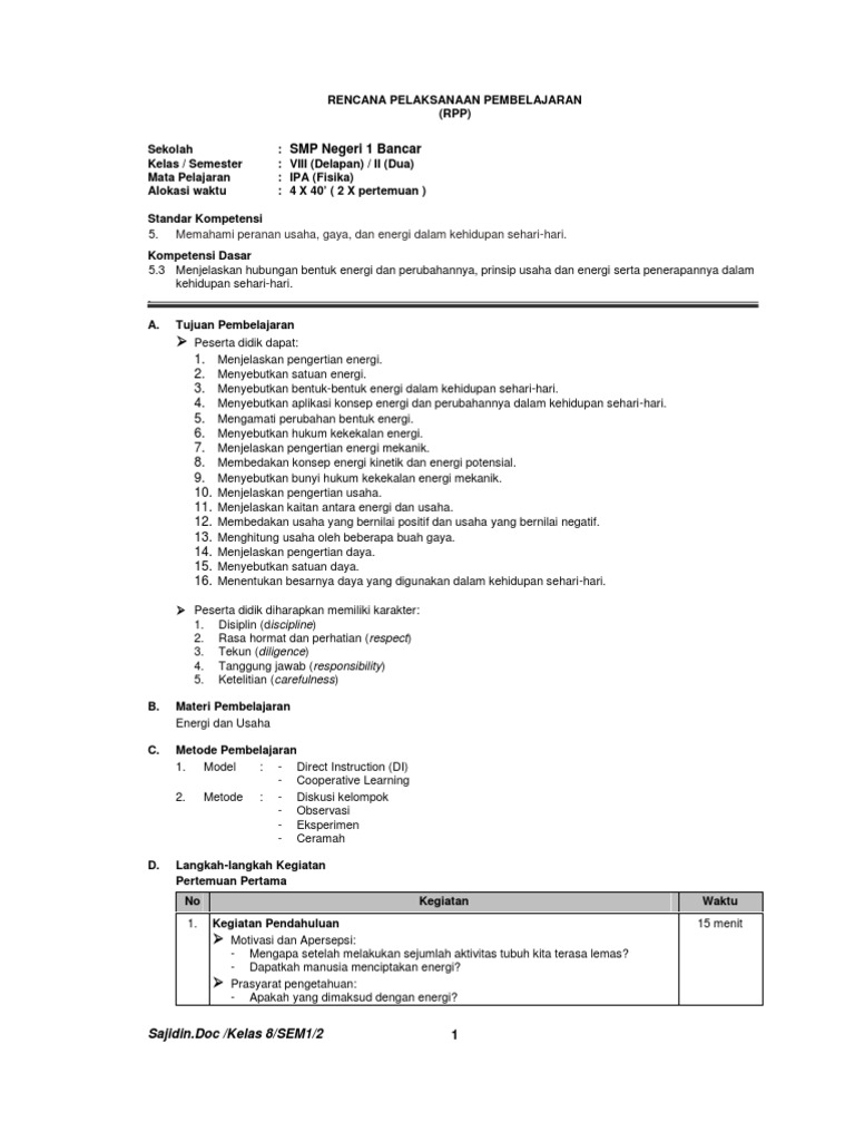 Rpp Fisika Smp Kelas 8 Energi Usaha Dan Daya