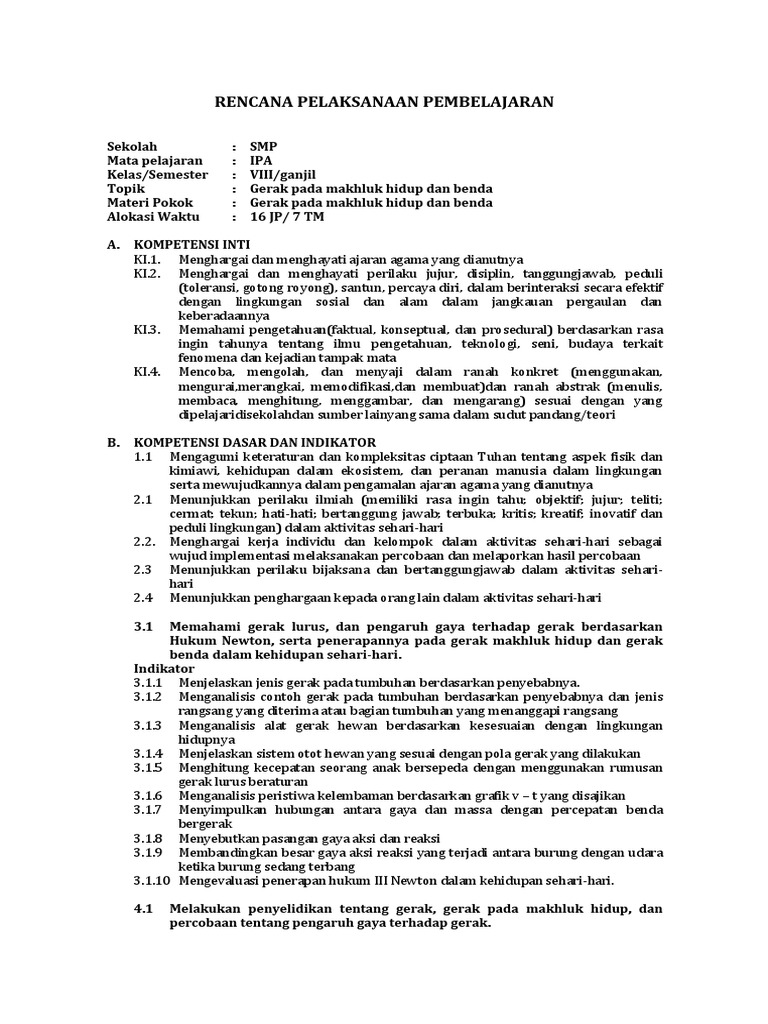 Rpp 1 Revisi Gerak Pada Makhluk Hidup Dan Benda
