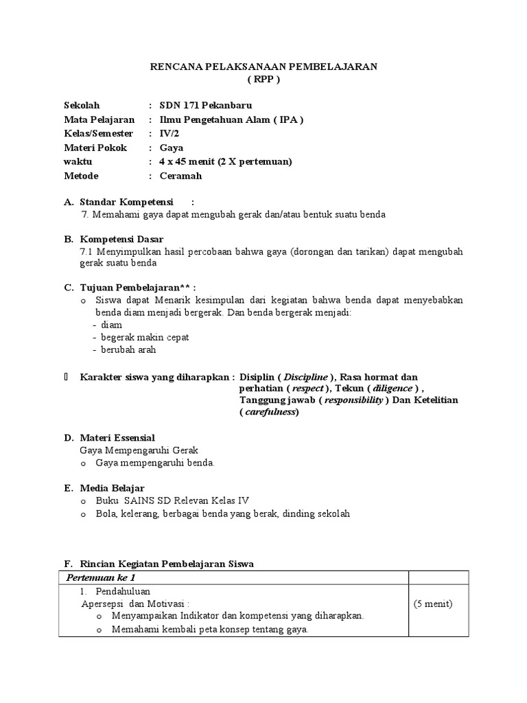 Rpp Ipa Sd Iv Ii Penerapan Konsep Perubahan Gerak Akibat Pengaruh Uda