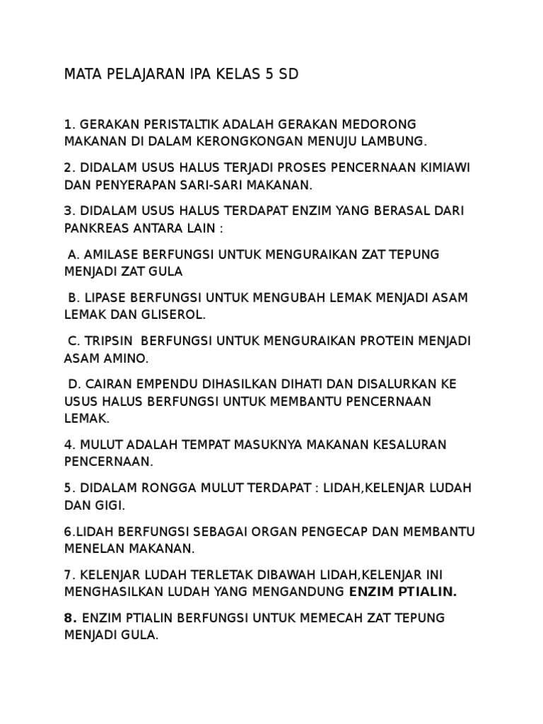 Soal Ipa Kelas 5 Semester 1 Bab Pencernaan Makanan