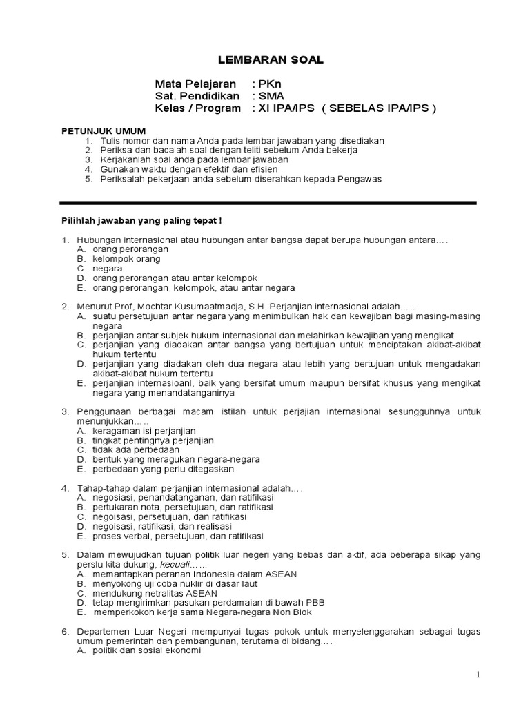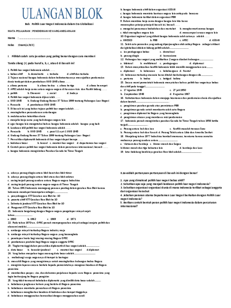 Soal Pkn Online Kelas 6 Sd Bab 5 Politik Luar Negeri Indonesia