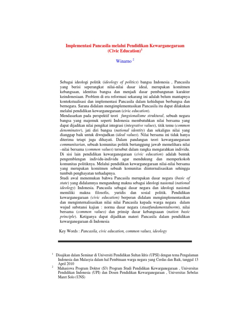 Implementasi Pancasila Melalui Pendidikan Kewarganegaraan Winarno