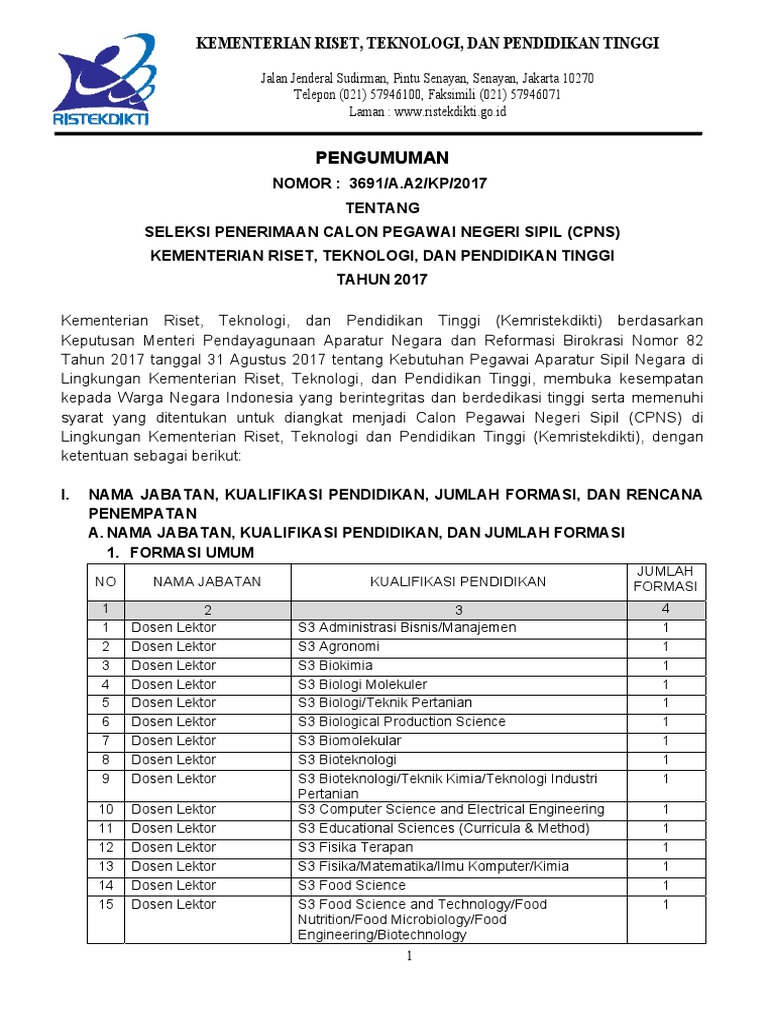 Pengumuman Cpns Ristekdikti 2017 Pdf