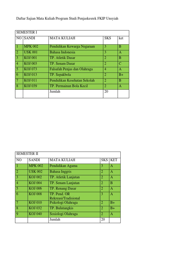 Daftar Sajian Mata Kuliah Program Studi Penjaskesrek Fkip Unsyiah