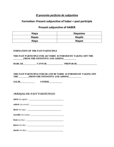 Spanish Present Perfect Subjunctive Worksheet Presente Perfecto
