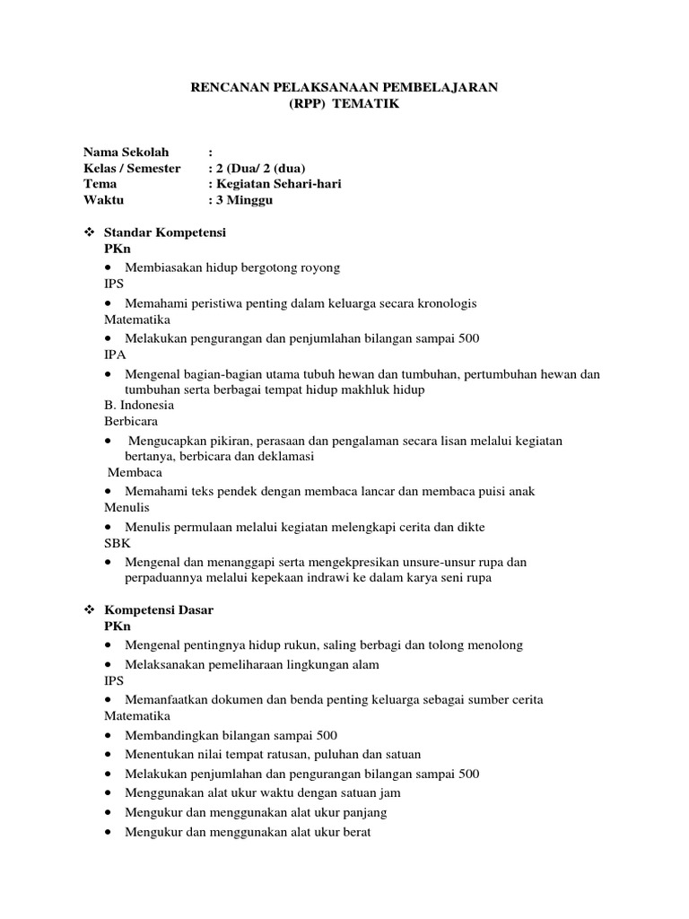 Rpp Tematik Tema Kegiatan Sehari Hari Kelas 2 Semester 2